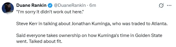 “我很遗憾他在这里没能成功,每个人都应该为库明加在勇士的表现负责。在他被交易之前,我和库明加进行了一次很好的谈话。我认为库明加本可以做得更好。”